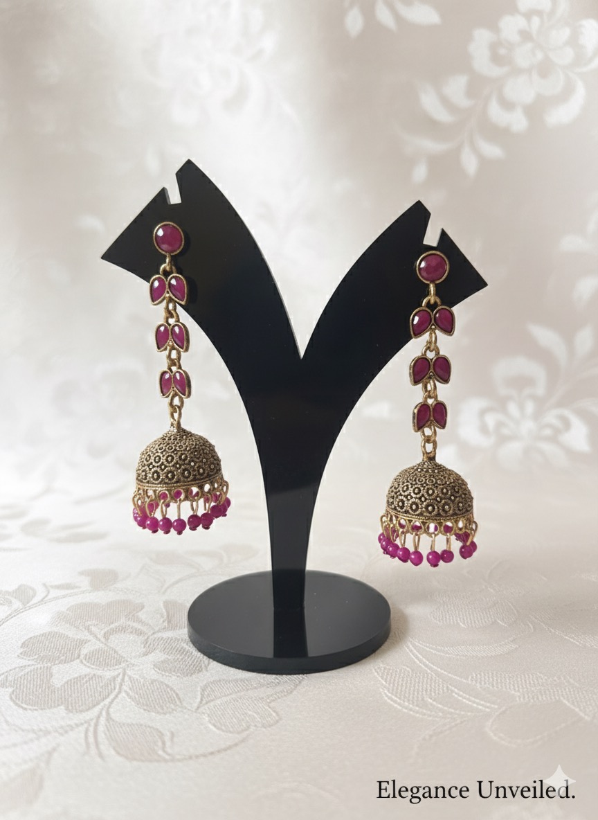 1. The Upper Section (Drop): This part connects to the earlobe and features a chain of linked, leaf-shaped, deep magenta or ruby-colored stones. There are typically three or four of these linked elements, providing a significant drop.